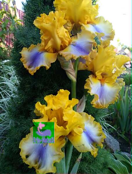 Солнечно желтые стандарты, на фоле – фиолетовое пятно , переходящее в ярко желтый край, бородки цвета темной календулы, фантастическая гофрировка.