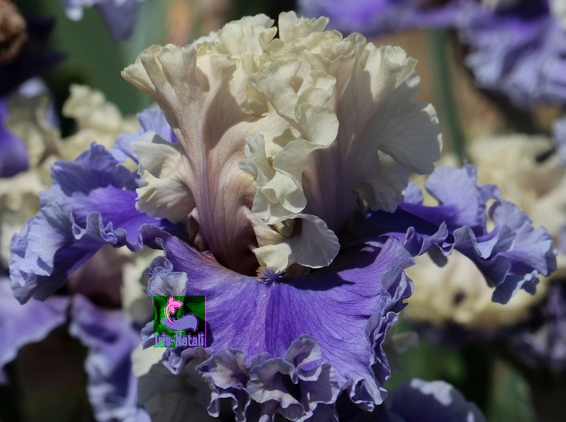 Бежевые стандарты с фиолетовым размытием вверх по средней жилке и легкой примесью золотого по краям лепестков. Насыщенно-лавандовые фолы, становящиеся светлее к краю. Жженые оранжевые бороды с темно-лавандовыми кончиками. Это очень классно выглядящий ирис с великолепными формами и широкими оборками на выставочных стеблях с обилием бутонов. Очень надежный и стабильно демонстрирует красоту в саду.