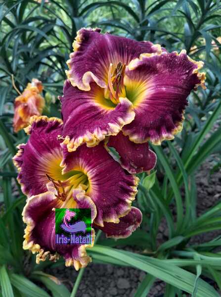 Индиго фиолетовый с большим зеленовато желтым водяным знаком и широкой гофрированной каймой такого же цвета.