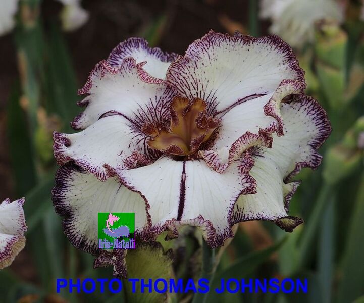 Первая плоская пликата. Никаких стандартов и шесть фолов. На стайлах такой же узор, как и край на фолах. Белые фолы, окаймленные и прошитые красно-фиолетовым узором.